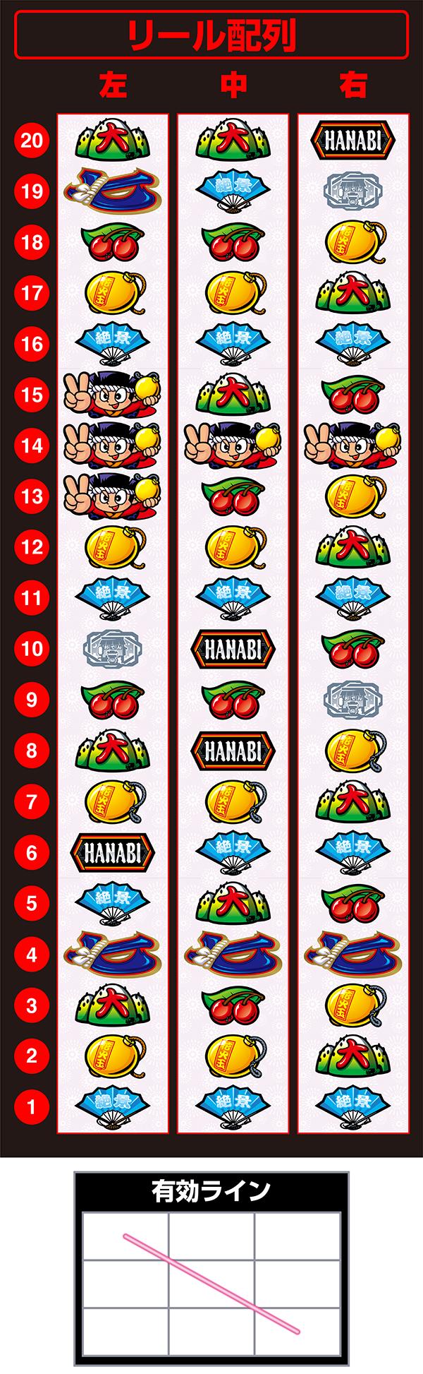 まずは配列をチェック! 有効ラインは右下がりの1ラインとなっているが、見た目は5ラインで小役が揃うので違和感を感じることはないだろう。