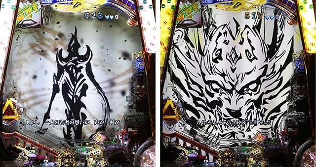 『牙狼』ファンには外せない激アツ保留変化は、もちろん本機にも搭載。先読み時はこれまで通り対象保留へ。当該変動での発生時は全画面で演出が展開する。また、色保留に刺さったり、ガセと思わせて斬馬剣が降ってくるなど、様々なパターンが搭載されている。