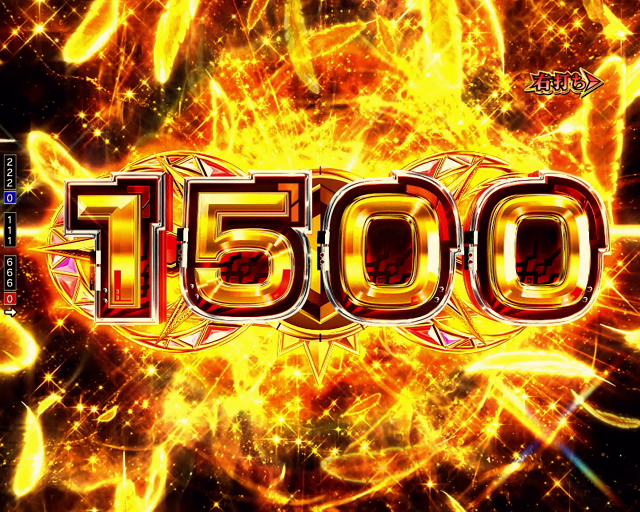 極アクエリオンRUSH中に図柄が揃い、V入賞時に「1500」の文字が表示されると10R大当り当選です。ラウンド中に3000FEVERへ昇格する可能性もアリ。終了後は極アクエリオンRUSHに再突入します。