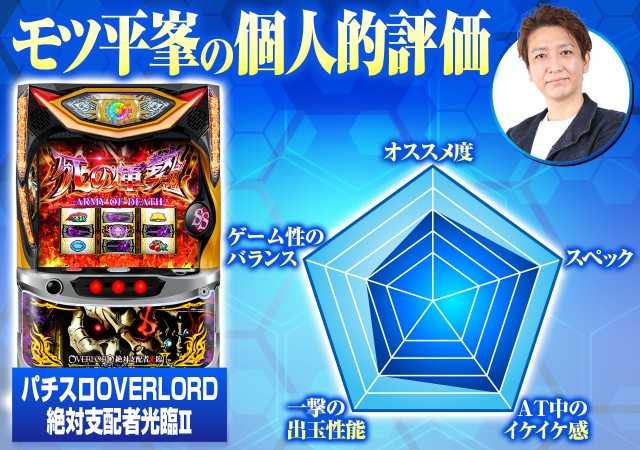 オバロ愛好家としては、AT中やボーナス中に曲選択機能を搭載していれば「4」または「5」を付けたかったというのが本音。2期OP曲「GO CRY GO」やED曲「HYDRA」を一生聴き続けたいオバロファンは全国に星の数ほどいますからね。オーイズミさん、本機の次作を開発する際はぜひ曲選択機能をお願いします!