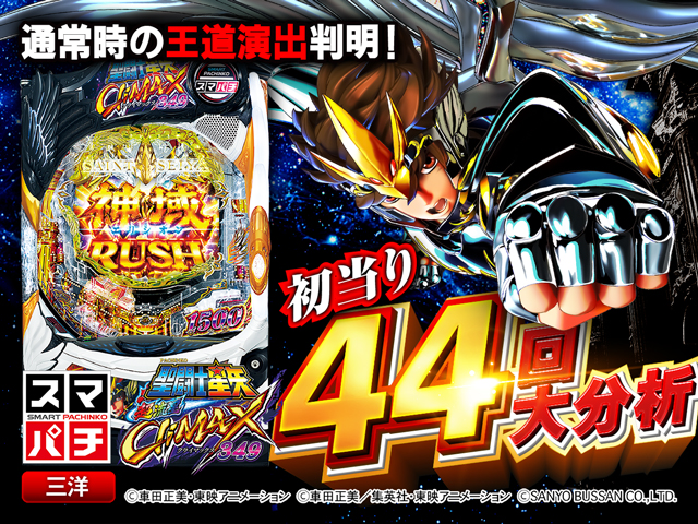 スマパチ第1弾として、4月3日にホールに登場した『e聖闘士星矢 超流星CliMAX349』。大当り確率は1/348.6とP機に比べると下がっているが、RUSHトータル継続率は約85%と高く、右打ち中はすべて1500個と大幅にパワーアップしている。さらにスマパチならではの新機能「Cタイム」も搭載されている。