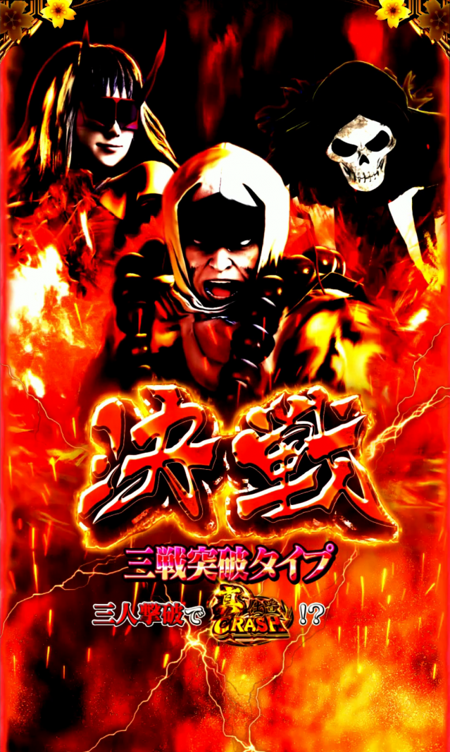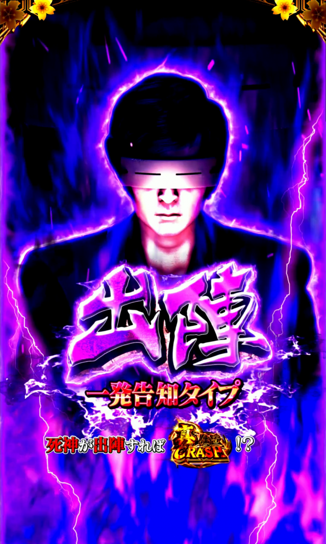 右打ち終了後には必ずCタイムの「死神チャンス」が発生し、チャレンジ成功で「真仕置CRASH」に突入します! 死神チャンスの成功期待度は約20%。時短引き戻しとCタイムを合わせた真仕置CRASH突入率は約74%となっていて、突入しやすく感じられる数値が嬉しいです。