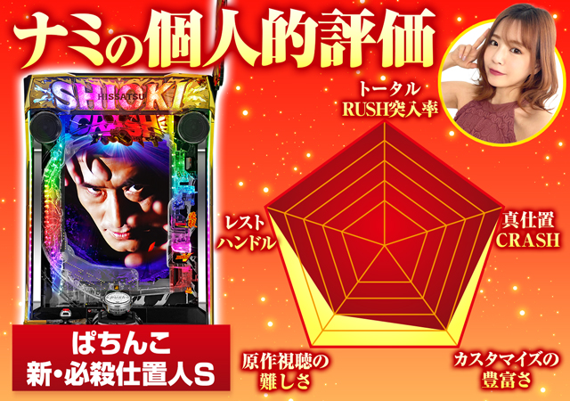 120回転の真仕置CRASHは、長く右打ち演出を楽しめるのが嬉しい! あと、時短100回転に付け加えてCタイムもつくので、初当りさえ引けばなんとかなりそう。というわけで、この高評価になりました!