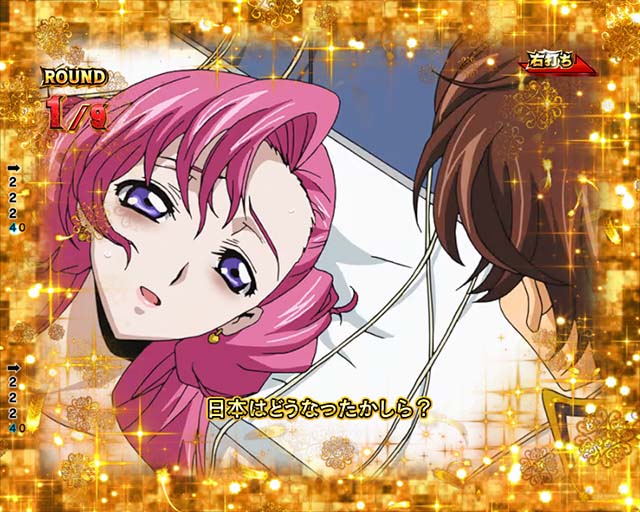 画面下部の制限時間ゲージがいっぱいになるまでにルルーシュ登場で大当りとなる、一発告知モード。C.C.が登場したり、赤文字のセリフが出ればチャンス。一発告知系の演出はあまり選択しないけれど、作中の名シーンがたくさん見れそうなので、このモードも選んでみたいです♪