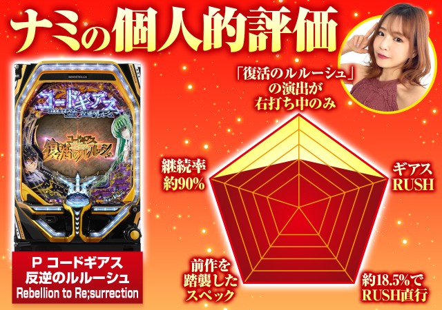 最近の機種は3000個大当りを搭載している分、継続率が低くなってしまい結果的に楽しい時間が短くなりがちだったので、前作のゲーム性を受け継いでくれたのが嬉しかったです。ギアスRUSHでルルーシュがギアスをかけまくる爽快感も健在♪