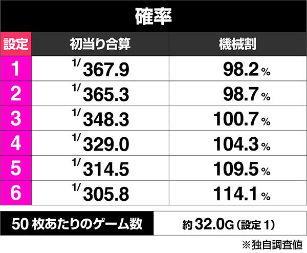| ガッツ数 | 設定1 | 設定2 | 設定3 | 設定4 | 設定5・6 |