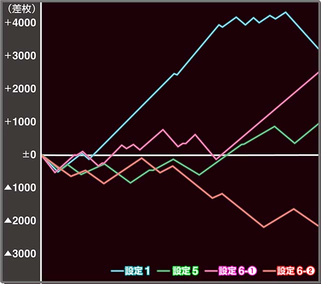 続いて今回採取した実戦データのスランプグラフですが、最も差枚がプラスになったのは「設定1」、最もマイナスを叩いたのが「設定6-②」という結果に。