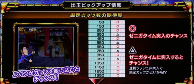 そしてこの「ゼニガダッシュを経由せずに前兆へ突入した場合のAT当選期待度」に設定差がある模様で、注目なのは下記の4つのガッツ数。