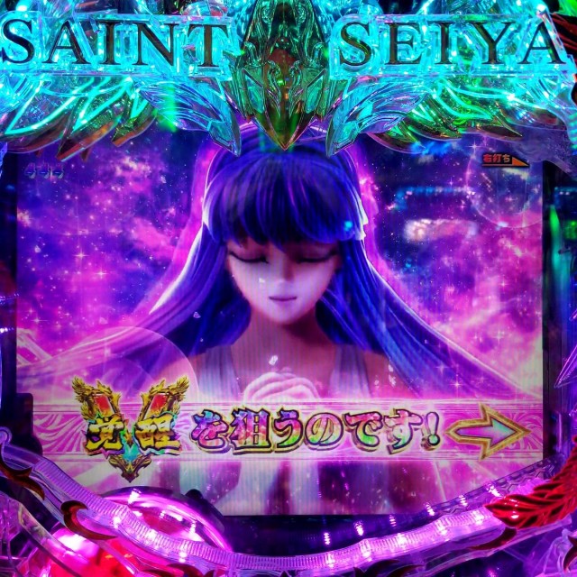 『P聖闘士星矢 超流星 女神ゴールドver.1500』にて、 アテナ登場からのV覚醒演出で大当り5%の女神覚醒3000をゲットですねん!