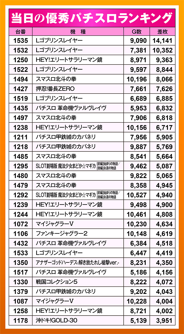 最新機種の『Lゴブリンスレイヤー』の2台が10,000ptオーバーを記録、『スマスロ北斗の拳』や『HEY!エリートサラリーマン鏡』も8,000ptという結果を残すなど、スマスロの多くが好成績!