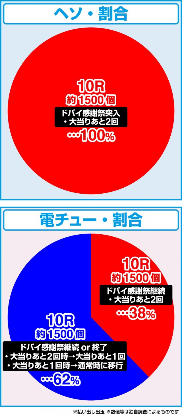 2回の大当りのうち、どちらか一方でも38%の「超TAKA須BONUS4500」を引くことができれば、そこから2回の大当りを再セットしていく仕組みで、平均大当り回数は約5.2回となります。