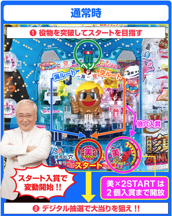 通常時はまず、ヘソから役物入賞を狙います。入賞した玉は、基本的には通常ルートの「海ルート」へ。タイミングよく2個連続で入れば、2個目の玉がチャンスルートとなる「空ルート」へ進みます。それぞれ最終的に美START、もしくは美×2START入賞で図柄変動開始となります。