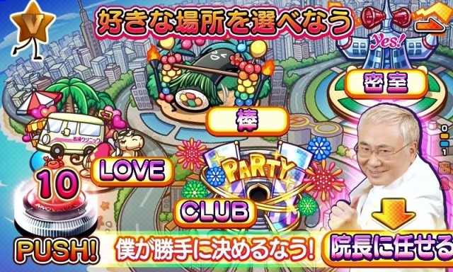 「ドバイ感謝祭」消化時は「CLUB」「LOVE」「棒」「密室」の4つの場所から好みで選択。選んだ場所に応じて演出が変化します。高須院長にお任せで選択してもOK。この演出に成功すれば、ドバイ感謝祭が再セットされます。