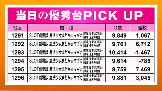 6.5号機では「沖ドキ!GOLD-30」、「押忍!番長ZERO」、「SLOT劇場版 魔法少女まどか☆マギカ[前編]始まりの物語/[後編]永遠の物語」が7,000ptオーバーを記録。