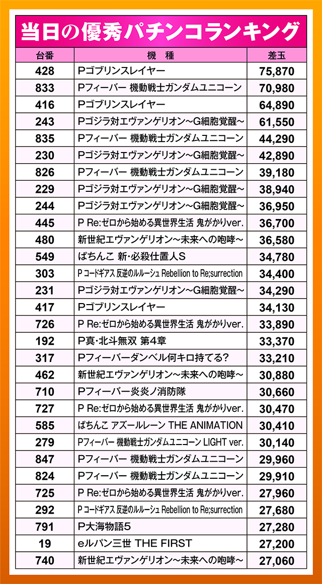 パチンコでは「Pフィーバー 機動戦士ガンダムユニコーン」、「Pゴジラ対エヴァンゲリオン〜G細胞覚醒〜」がとくに盛況。60,000pt超や70,000pt超といった圧巻のデータを残した。