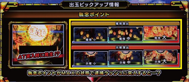 執念ポイント示唆演出で必ず押さえておきたいのは所持数示唆がMAXの場合だ。エフェクト大がそれに該当するので、もしそれが出た場合は次回ATまでヤメるのは厳禁。執念ポイント開放までプレイしよう。