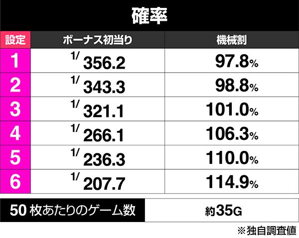 CZ確率においては、設定6が抜きんでた数値となっている。実戦時においては最低でも1/130以下を判別基準にしていきたいところだ。