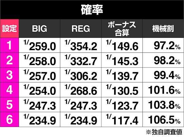 設定6実戦時のチェリー+BIG確率はさすがに下振れだと思うので判断ができませんが、REG確率においては今回も設定差が大きい部分だと考えられるでしょう。