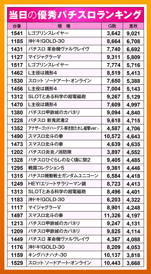 「Lゴブリンスレイヤー」が9,021pt、「パチスロ 革命機ヴァルヴレイヴ」が6,692ptと、スマスロにも好成績が目立つ。