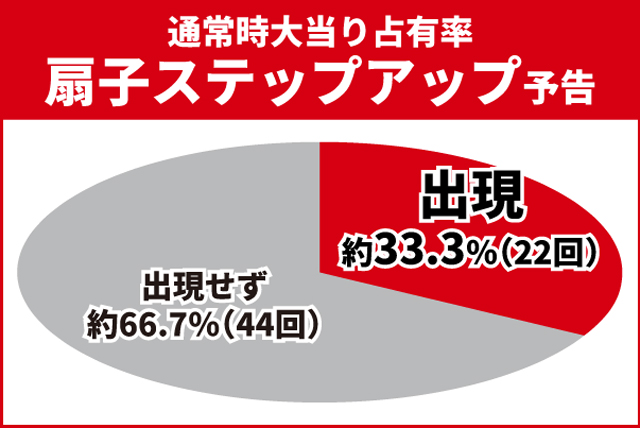 扇子の色とステップ数で期待度が変化する予告。扇子の色は赤が最も多く出現。ステップ数はステップ3と5が同数で、ステップ4止まりなどは出現しなかった。