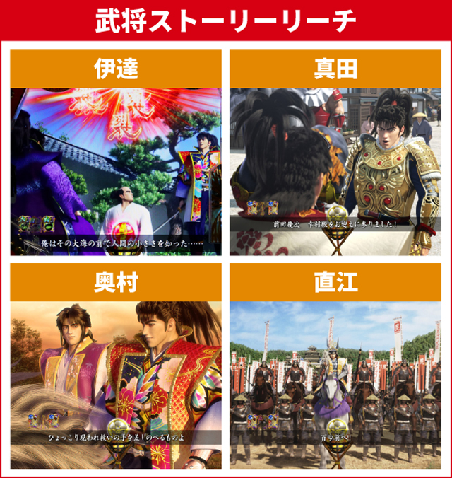 武将リーチで最も多く大当りしたのは真田だったが、武将ストーリーリーチでもトップを獲得。 2位は4武将の中では最も信頼度の高い直江だ。