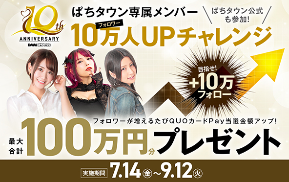 ぱちタウン公式を含めて、ぱちタウンの専属メンバーのフォロワーが合計1万人増加するたびに、1万円分のQUOカードPayの当選人数が増えていくキャンペーン。10万人UPチャレンジ達成で100万円分プレゼントです。