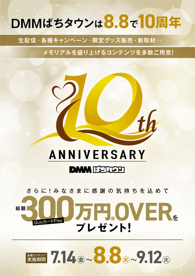 10周年当日の8月8日(火)に4時間前後の生配信を予定していますし、各種キャンペーンも実施予定です。さらに、生配信とキャンペーンでは、DMMぱちタウンユーザーの皆様に、総額300万円OVERのQUOカードPayが当たるんです!