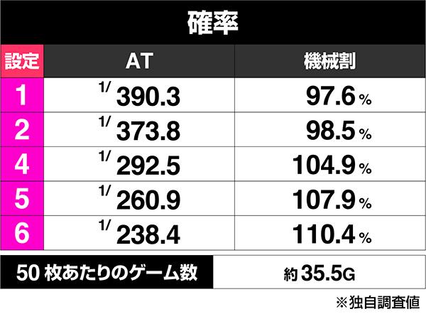 とりあえずは「AT終了画面」や「称号」は活用してもらいたいのだが、やはりATの初当りに格差があるのは分かっているので、CZの出現率やAT直撃に設定差がある可能性あり。設定6はかなりAT初当りが優遇されているので必ず糸口はある。そこらへんに注目し、設定の高低を判断してもらいたい。