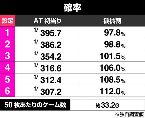 本機の設定は基本的な6段階。「AT初当り確率」にはそこそこの設定差があるものの、設定6でも1/300を超えているので1日打っていれば何度か大きなハマリを食らってしまう可能性は高そうです。