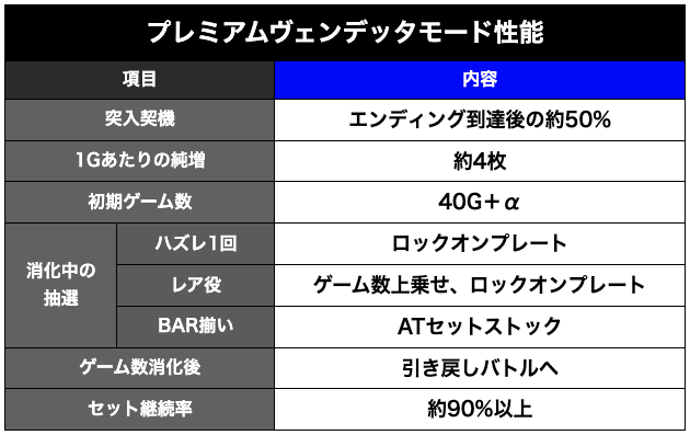 エンディング後に突入可能性がある、上位ATの「プレミアムヴェンデッタモード」。もしかしたら今回の実戦データで1番価値があったのは設定6のデータではなく、設定5の「プレミアムヴェンデッタモード」のループだったかもしれません。