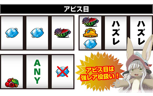 アビス目成立時に関してはCZだけでなくAT直撃まで抽選している。こちらも基本的には高設定ほどCZまたはAT当選率が高い。ちなみにアビス目は以下の通り。