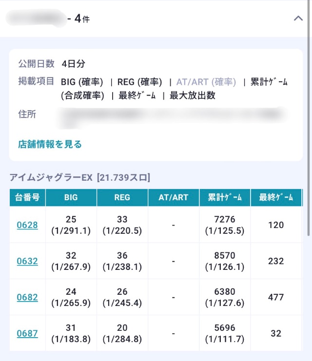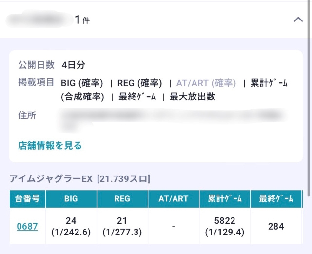 まずは当日のデータがわかる23時以降に検索してみたところ、4件該当したホールが1店舗見つかりました。