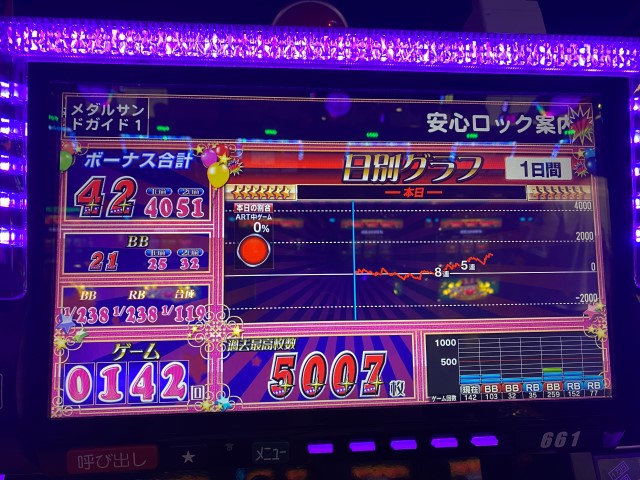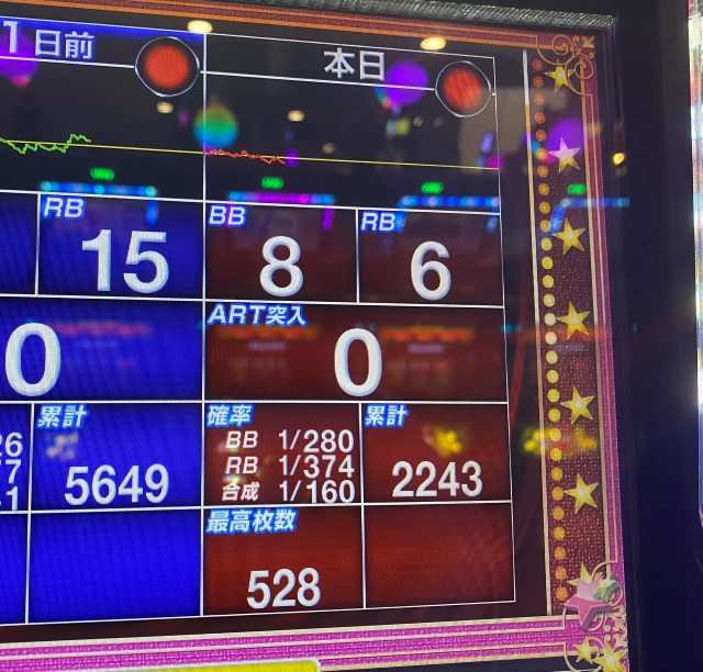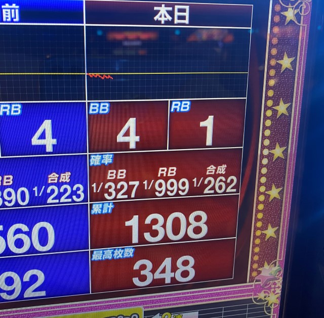 いや~、本当に良かった。1台目、2台目とスカり続けましたが、データ検索でジャグラーに力を入れていることがあらかじめわかっていたので、粘り続けた甲斐がありました。
