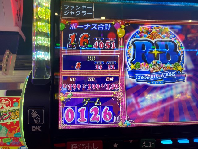 狙えそうな台を探して巡回していたところ、こんな『ファンキージャグラー2』を発見しました。