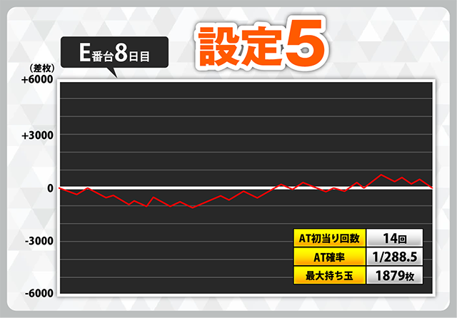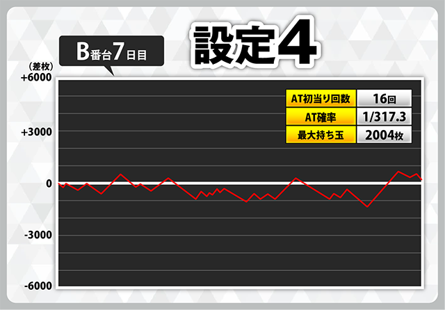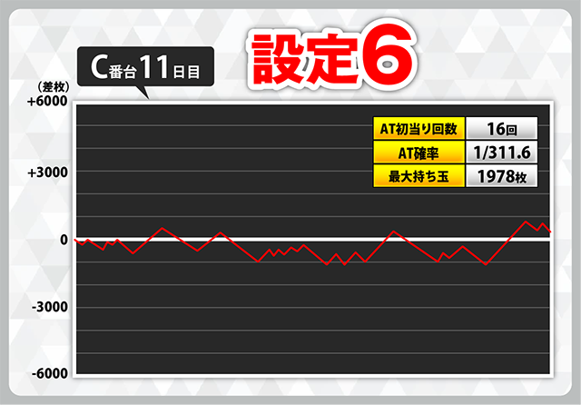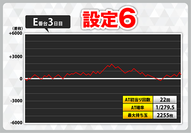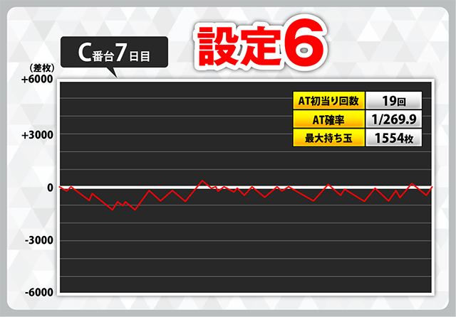 同様に高設定域の台数も変わっていないのですが、こちらは設定4が1台増え、設定5が1台減っただけで、設定6は変わらないなど大きな変化はないように感じました。ただ、スランプグラフを見ると、設定6でもかなり厳しい内容になっていて、ある程度大きく勝つには「上位ATに入れる」というのが、どの設定でも必要になってきそうです。