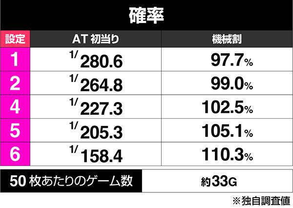 まずはAT初当り確率と機械割からご覧いただこう。AT初当りに関しては設定の高低で格差がつけられており、長い目で見れば体感的にも感じられると思われる。設定6に関してはかなり破格のAT初当り確率と言えよう。