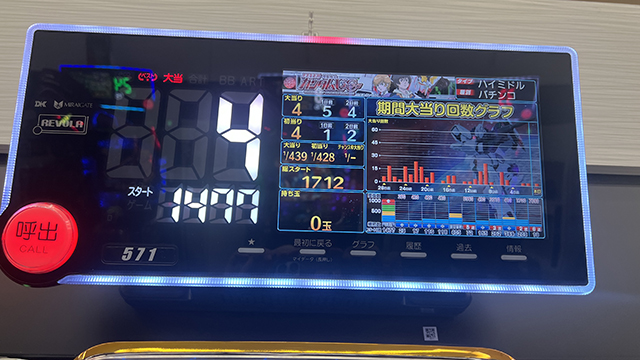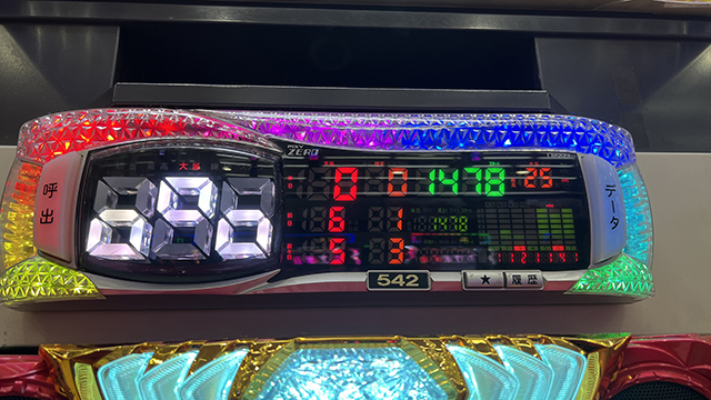 データ検索で1374回転、確保した時には1478回転と、こちらも直前まで誰かが打っていたと思われる台です。その証拠にハンドルを握るとまだ温かかったですし。