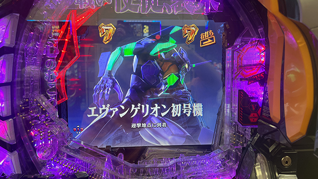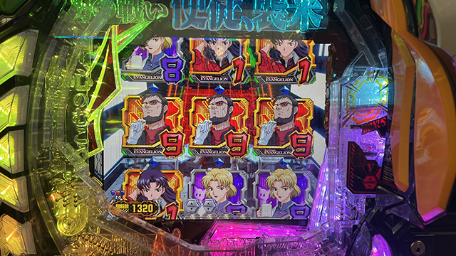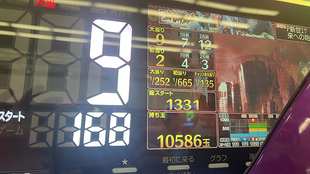 『新世紀エヴァンゲリオン〜未来への咆哮〜』です。データ検索で1229回転、確保したときは1306回転と、これまた前に打っていた方がヤメてすぐの台だと思われます。