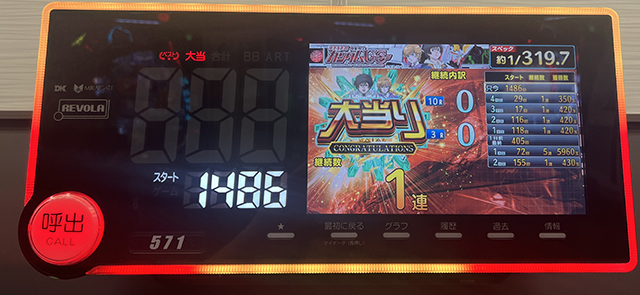 1486回転で大当り獲得! 打ち始めてから309回転なので、個人としては確率分母も回していませんが、あとはRUSHに入って出玉が獲得できれば文句なし!