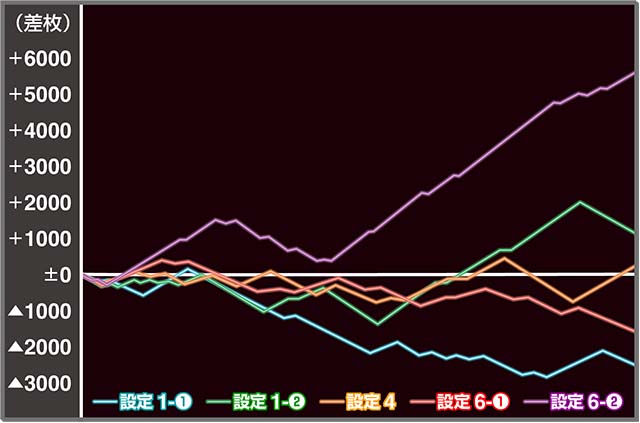 こちらが先ほどの設定6爆裂データを含む設定1・4・6計5本分のスランプグラフです。
