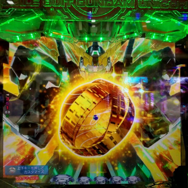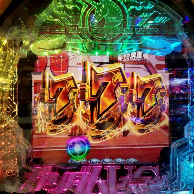 『Pフィーバー 機動戦士ガンダムユニコーン』にて、通常時にユニコーンガンダム出現から金保留、 金シャア・カットイン、虹保留変化と共に7揃いをゲットですねん!