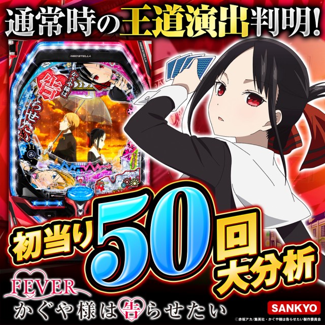 パチンコ・パチスロでは初登場となる、大ヒットコンテンツとタイアップした『Pフィーバーかぐや様は告らせたい』が遂にホールデビューした。スペックは大当り確率1/319.7、STトータル突入率約74%・160回転・継続率約81%のロングST機。そう、今なお人気絶頂の大ヒット機種『エヴァ未来への咆哮』に似た性能となっているのだ。