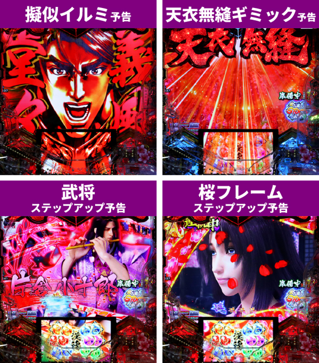 先読み系では保留変化予告・緑保留以上とゾーン予告、そして漢魂ストック予告も早めにストックしておきたいところ。当該では義風堂々連続予告が3連まで発展したら、擬似イルミ予告を経由して、テンパイ後に桜吹雪予告を待つ。そしてストーリーリーチに発展したらタイトル赤が出現すれば大当りは目前だ。