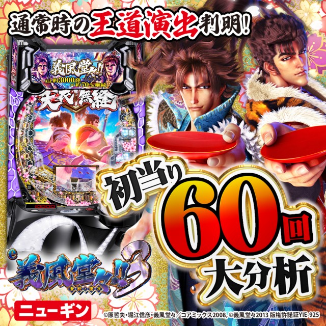 今年の夏に『e花の慶次〜裂』が登場したが、そのスピンオフシリーズ「義風堂々」の最新作もスマパチで登場した。それが『e義風堂々!!〜兼続と慶次〜3』だ。本機最大の特徴は3000個比率で、初当りで20%、右打ち中は69.5%もあるところ。3000個の出玉が約70%で継続していくという、圧巻の出玉力が味わえるのだ。