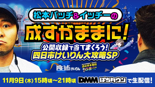 11月9日(木)15時頃から配信予定の『【四日市競輪生配信】松本バッチ&イッチーの成すがままに! 公開収録で当てまくろう!四日市けいりん大攻略SP』をお見逃しなく!!