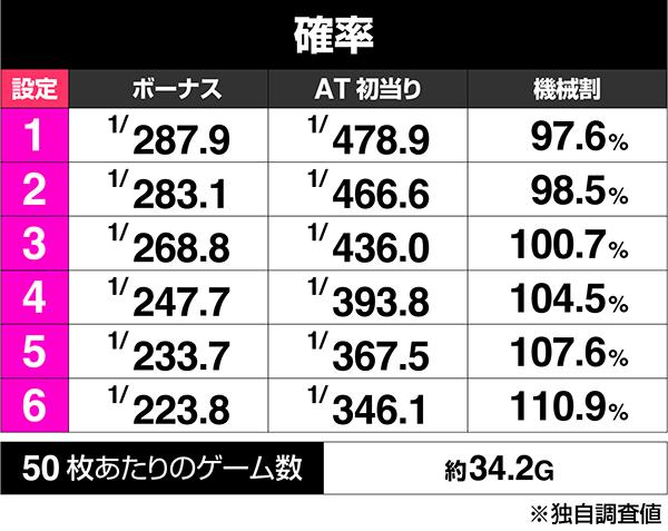まずは簡易スペックをご覧いただこう。ボーナス確率・AT初当り確率ともに段階的にアップしているのが特徴。ボーナスよりもAT初当りのほうにかなりの格差が設けられているので、AT突入の頻度をしっかりチェックしていきたい。