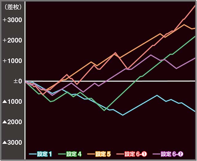 続いて今回試打した全設定のデータをスランプグラフで見ていきましょう。