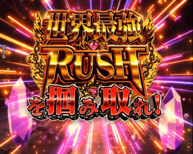 「最強」という文字エフェクトが現れる演出。発生タイミングを問わず、大チャンスです。同一変動内で2回発生したり、当落煽り時に発生すると超激アツ!