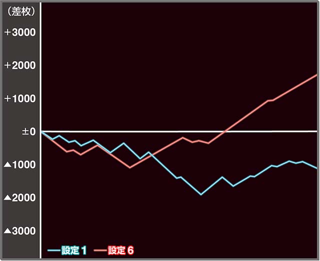 完全攻略時における設定6の機械割が108.5%を誇る本機。ゲームフローなどは機種ページをご覧いただくことにして、まずは今回試打をした設定1と6のスランプグラフからチェックしていきましょう。