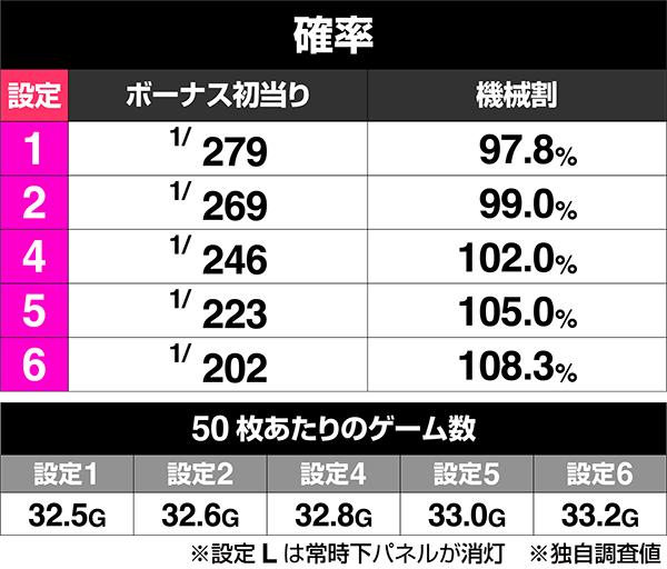 実質的な設定は5段階。これまでのシリーズ同様に、擬似ボーナスが連チャンしていくAT機となっており、高設定ほどボーナス初当り確率が高い。機械割はMAXで108.3%。この手の機種はそこまで機械割は高くないが、設定6であれば終日勝負は可能であろう。